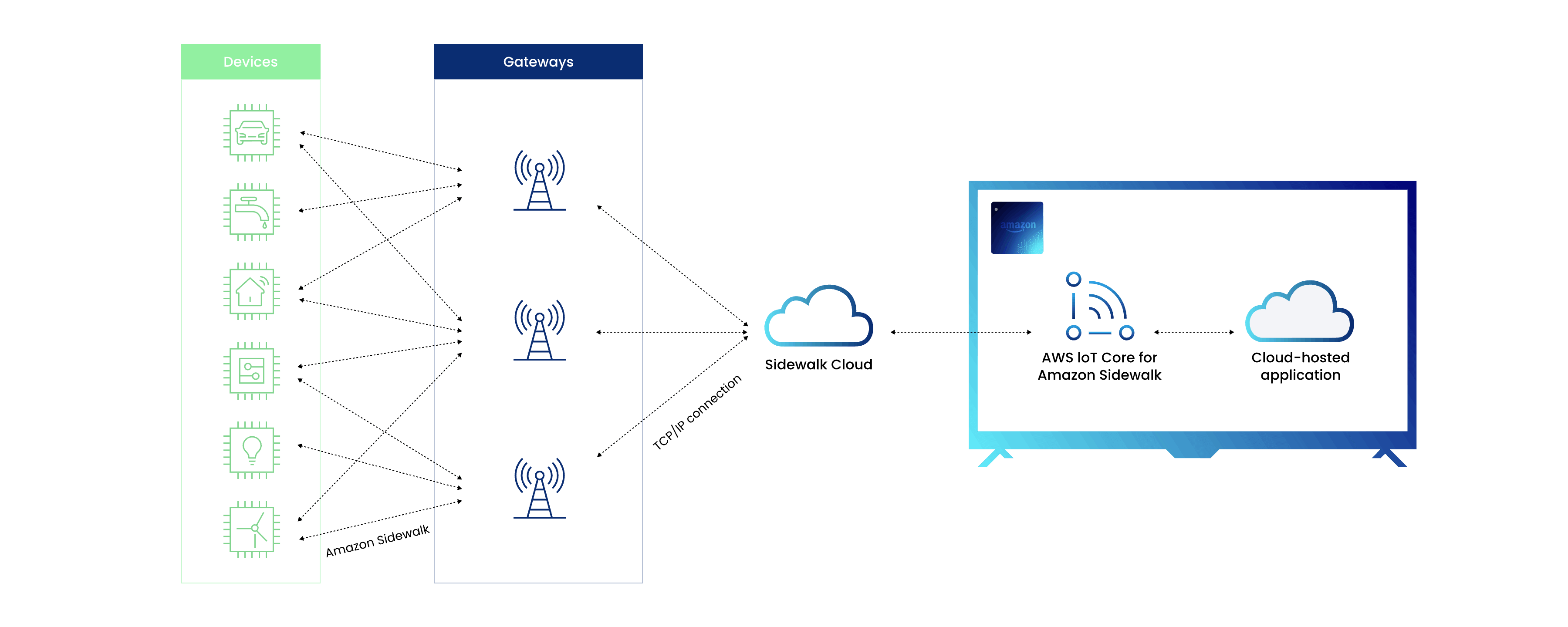Amazon Sidewalk is a secure community network that uses Amazon Sidewalk Gateways (also called Sidewalk Bridges), such as compatible Amazon Echo and Ring devices, to provide cloud connectivity for IoT endpoint devices. Amazon Sidewalk enables low-bandwidth and long-range connectivity at home and beyond using Bluetooth Low Energy for short-distance communication and LoRa and FSK radio protocols at 900MHz frequencies to cover longer distances.